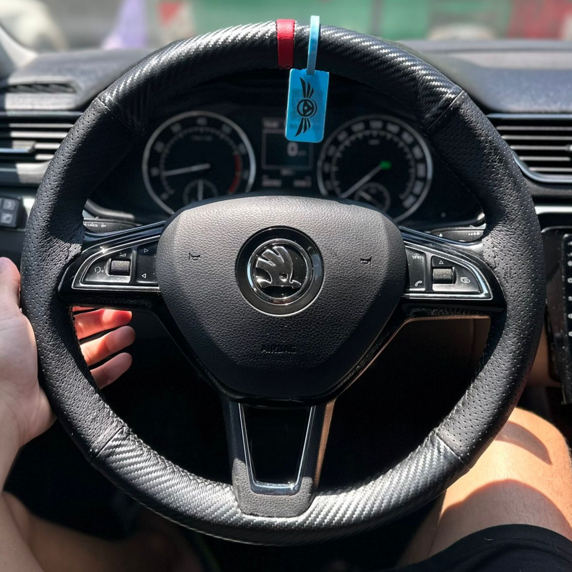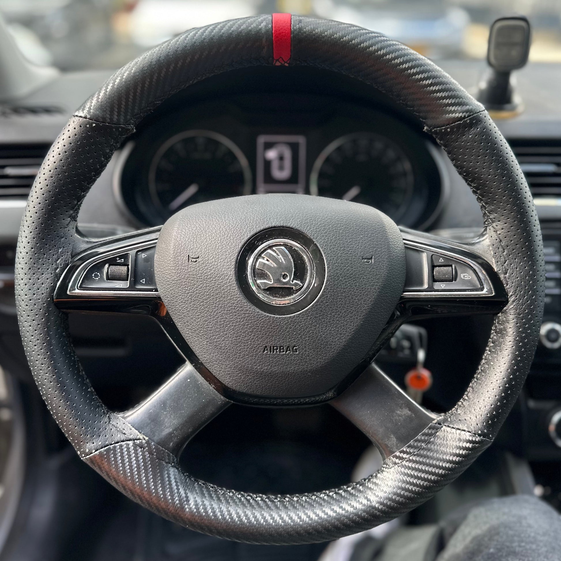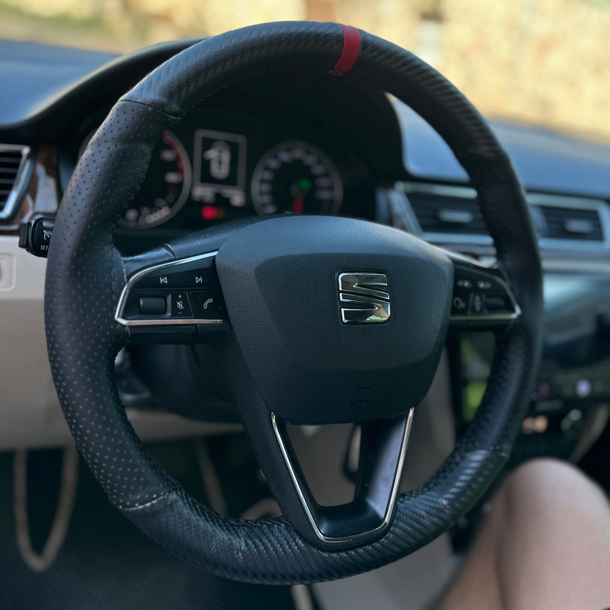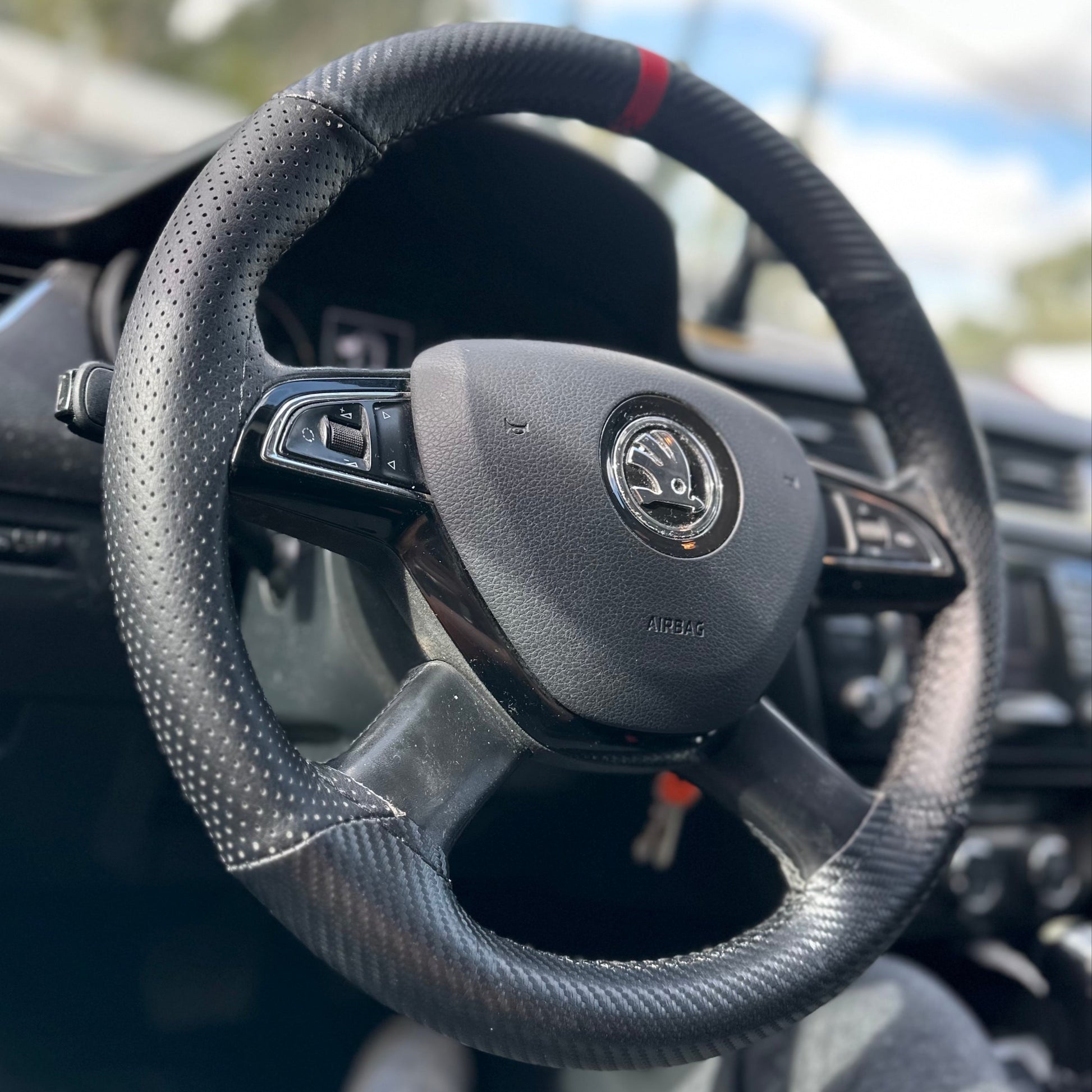 כיסוי מעור אמיתי בגימור קרבון עם תוספת פס מרכוז למראה סופר ספורטיבי ויפה, עם שילוב עור מחורר באיזורי האחיזה.