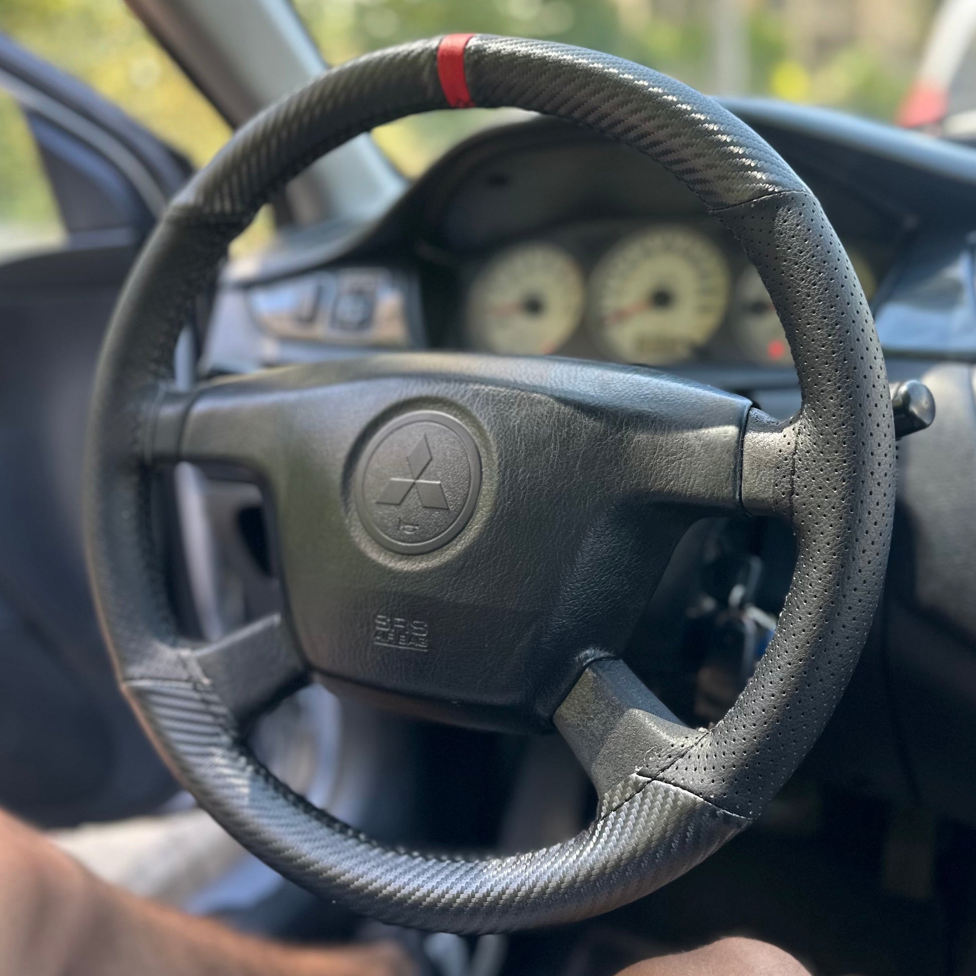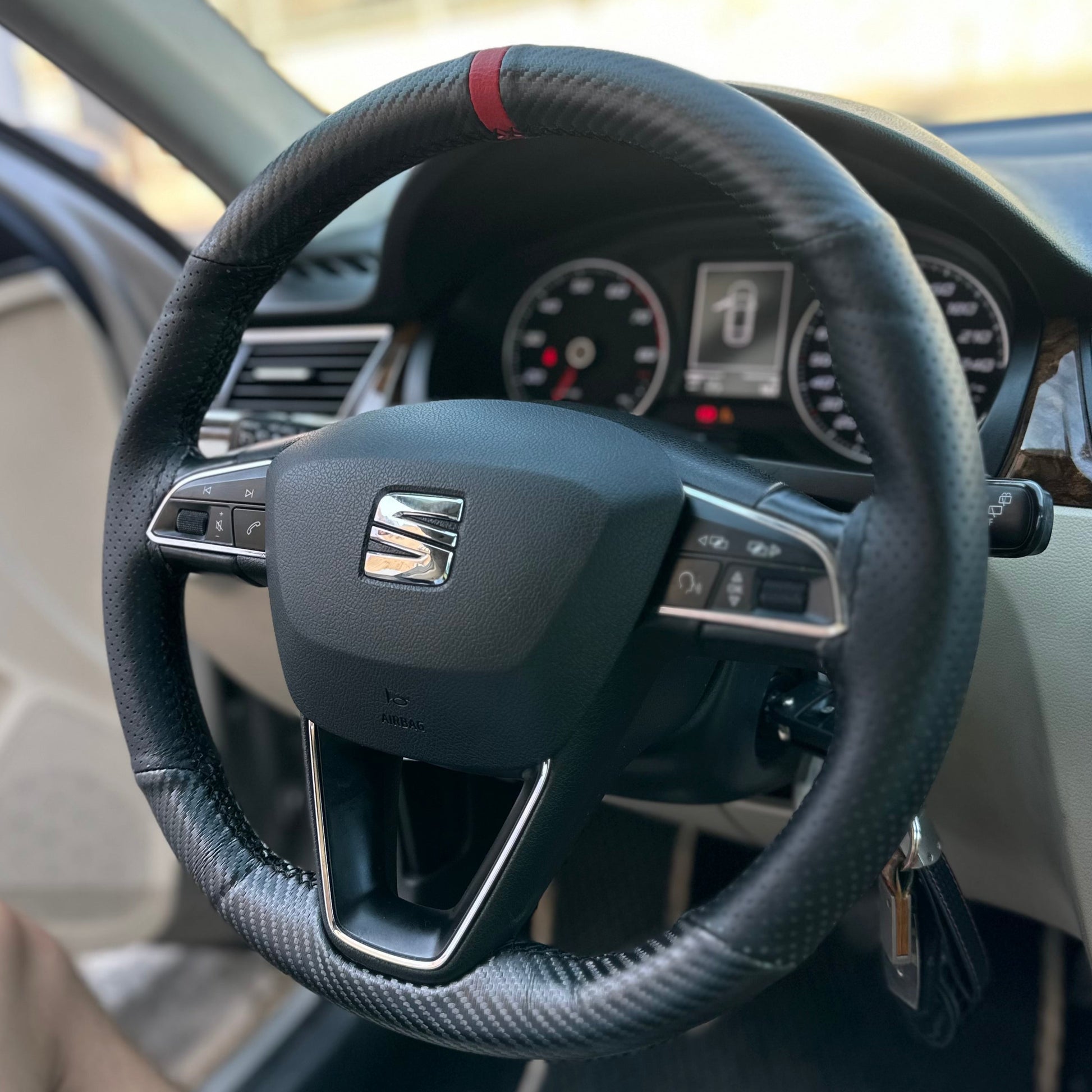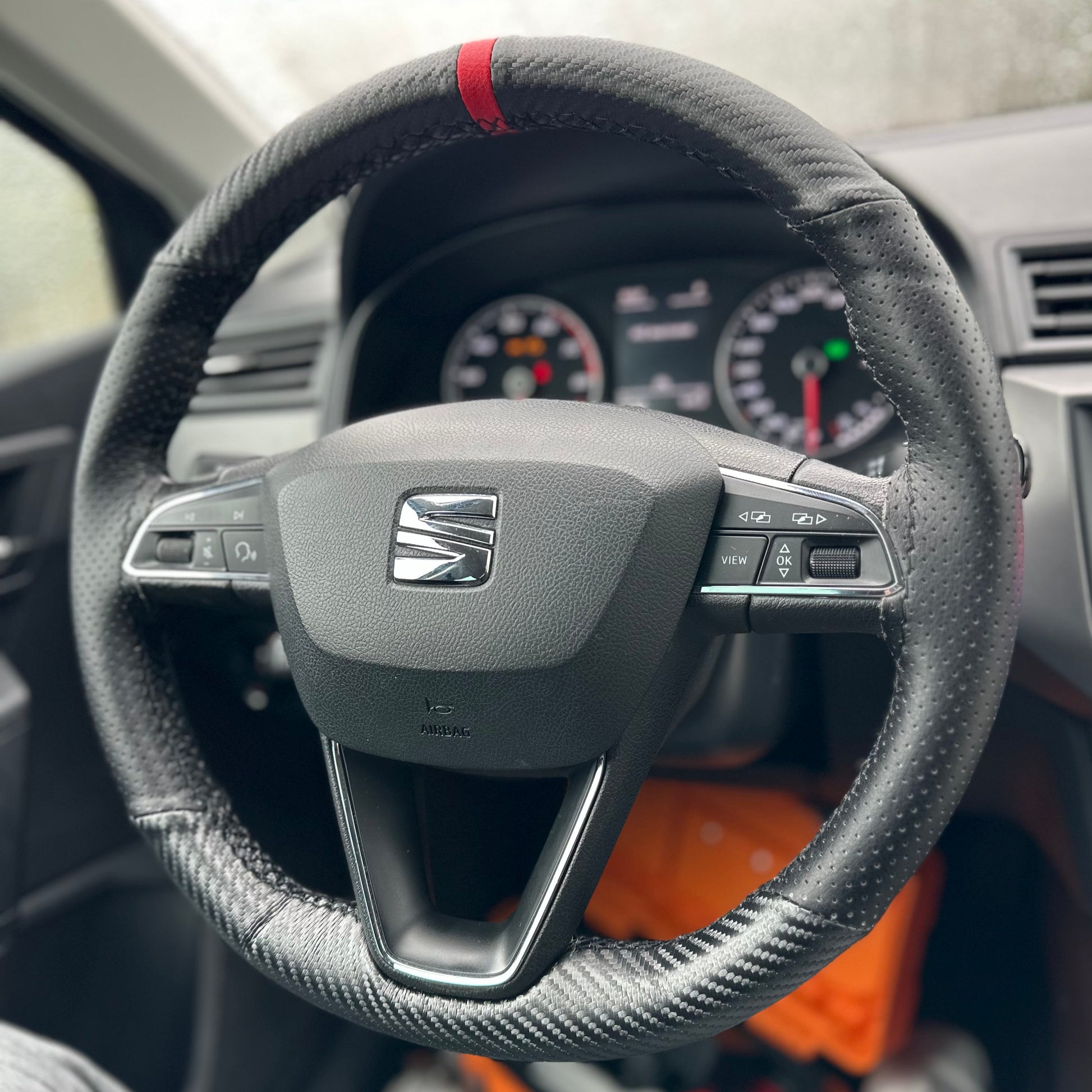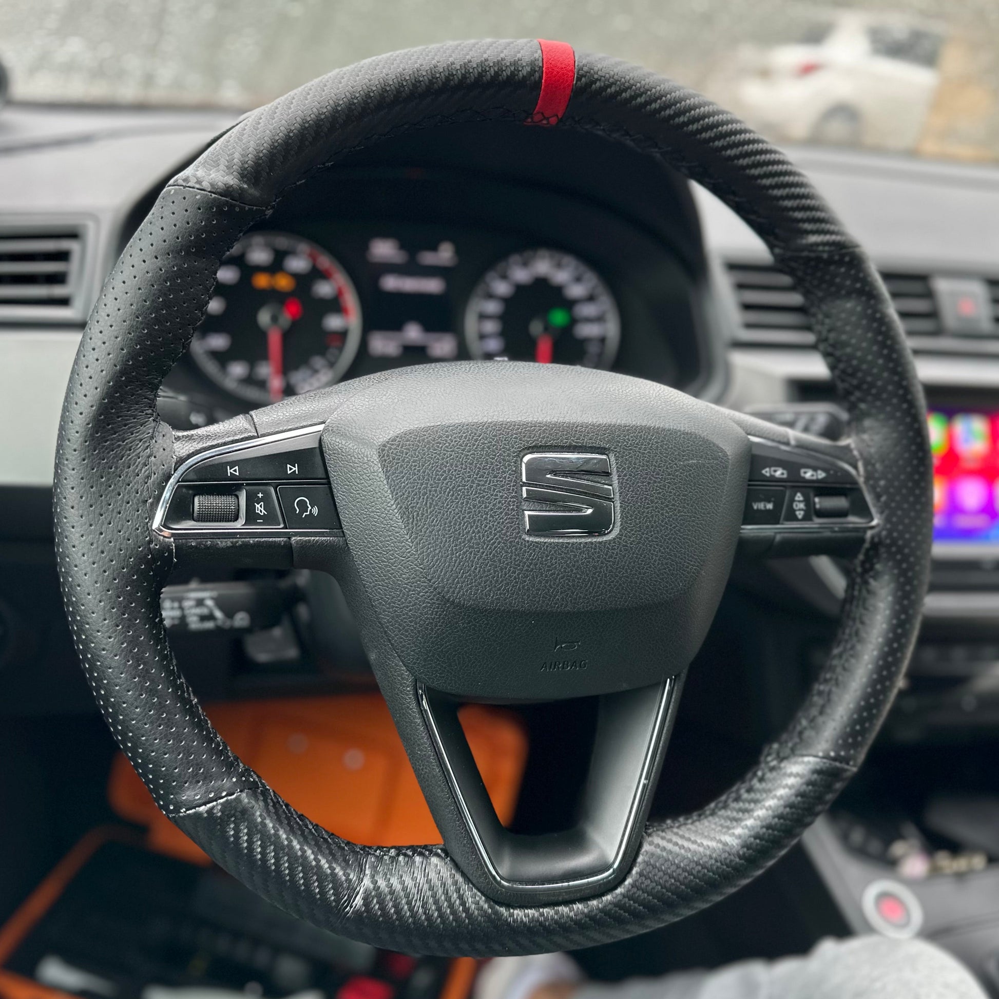 כיסוי מעור אמיתי בגימור קרבון עם תוספת פס מרכוז למראה סופר ספורטיבי ויפה, עם שילוב עור מחורר באיזורי האחיזה.