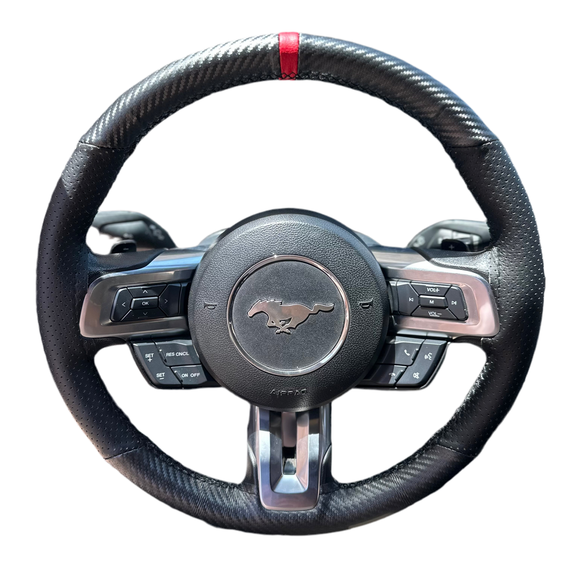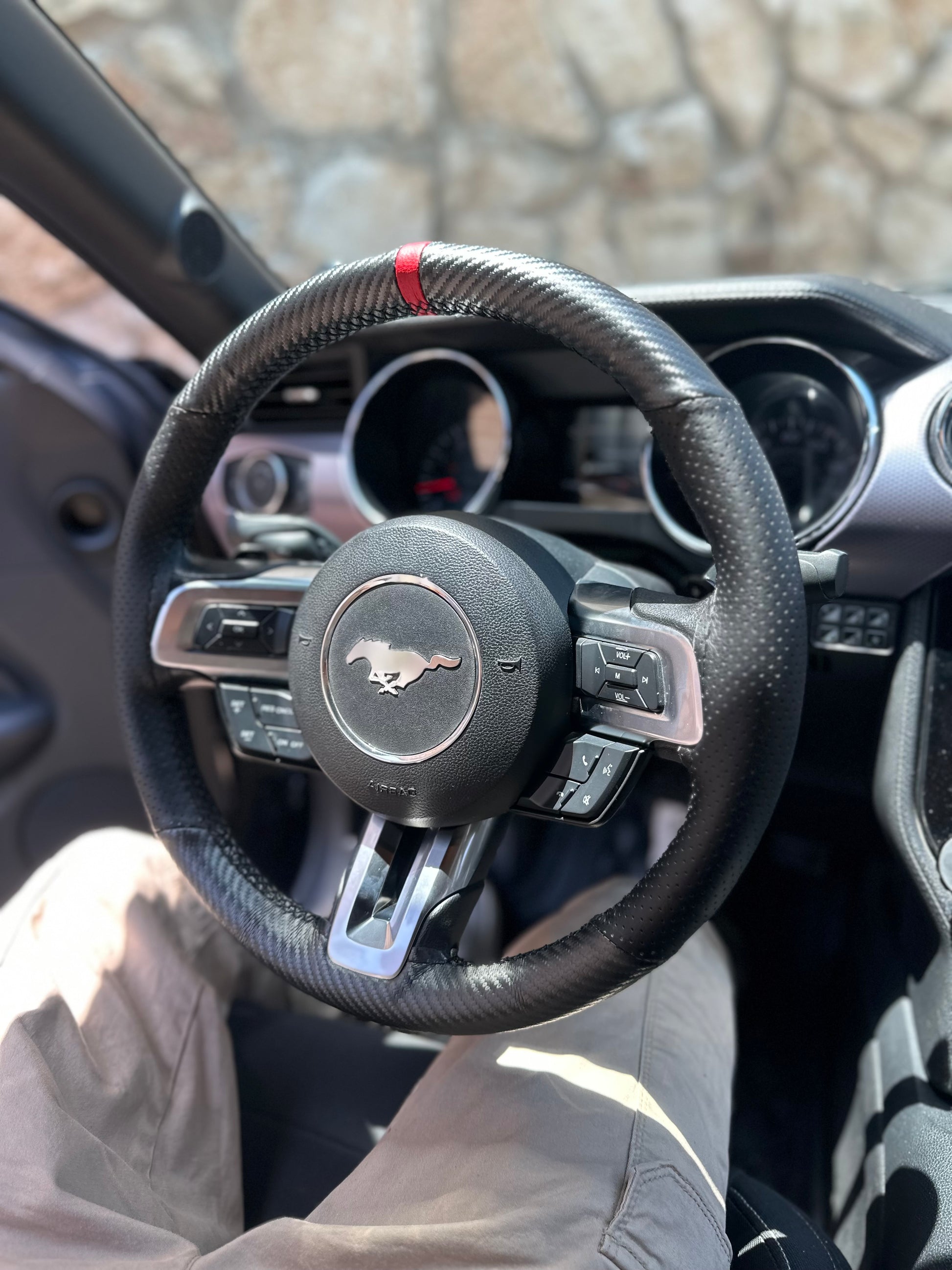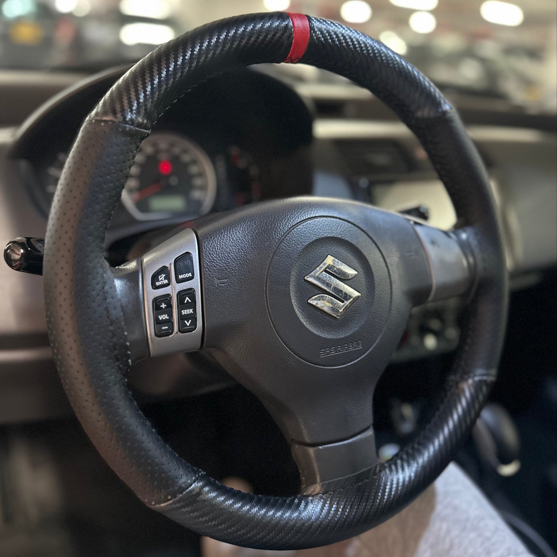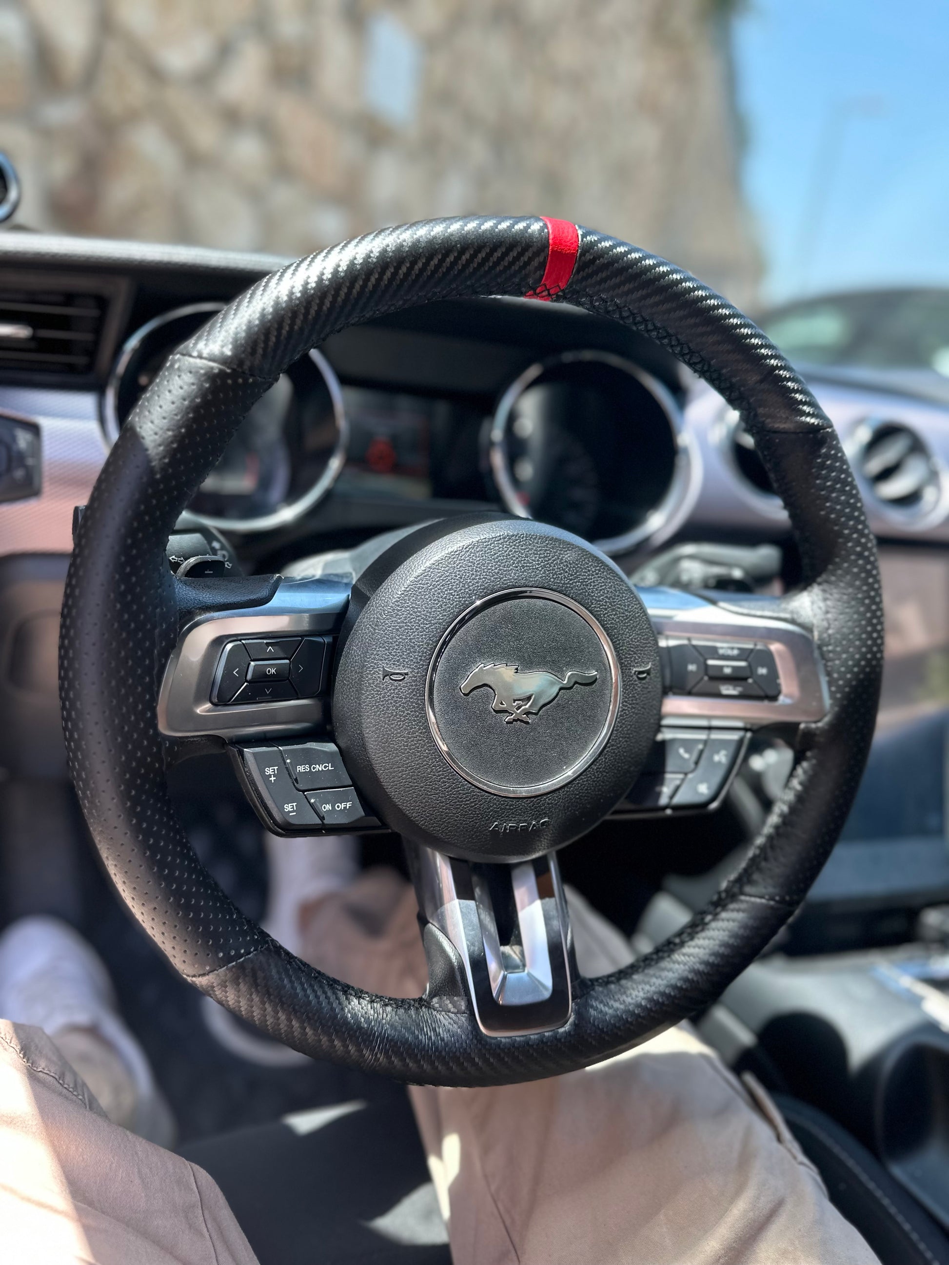 כיסוי מעור אמיתי בגימור קרבון עם תוספת פס מרכוז למראה סופר ספורטיבי ויפה, עם שילוב עור מחורר באיזורי האחיזה.