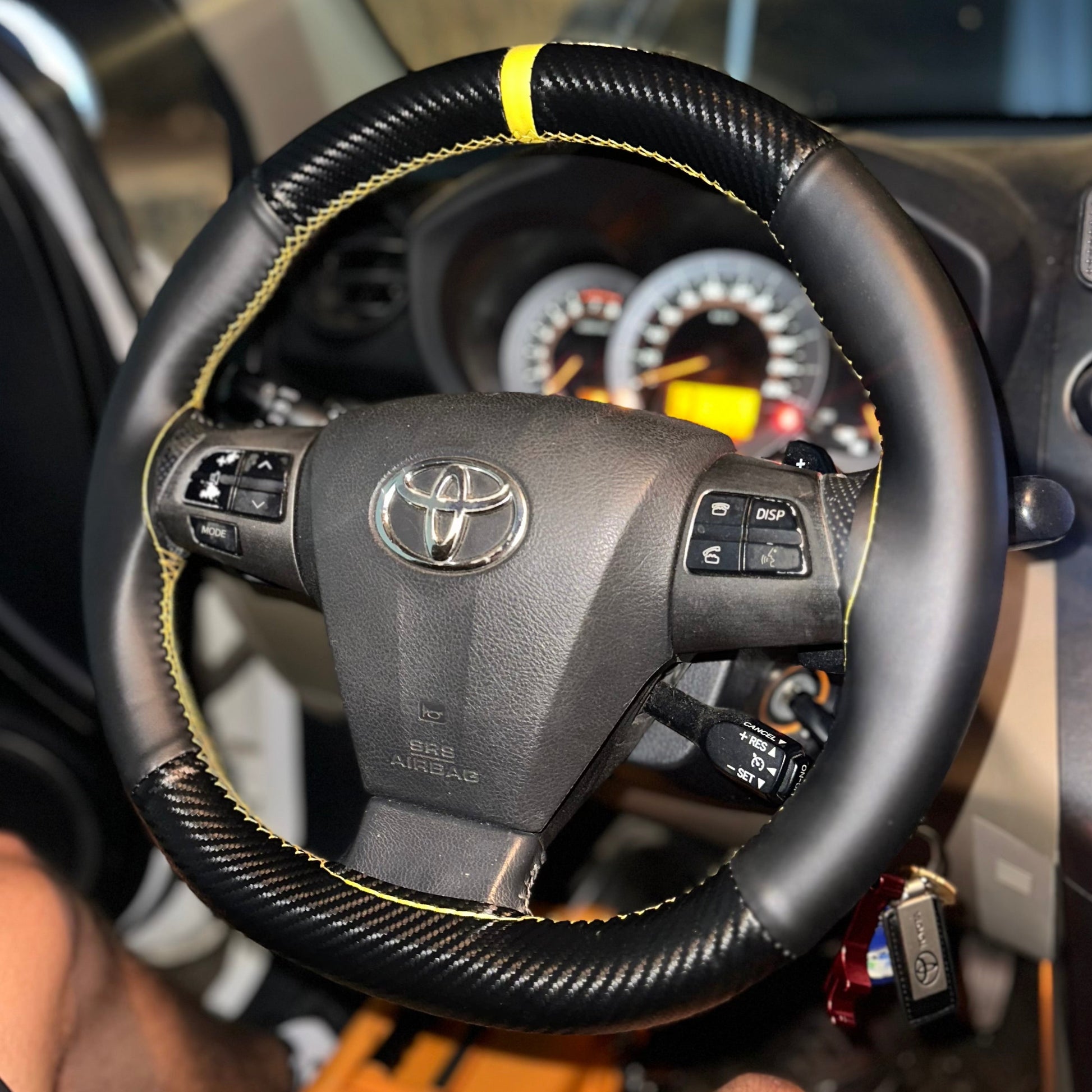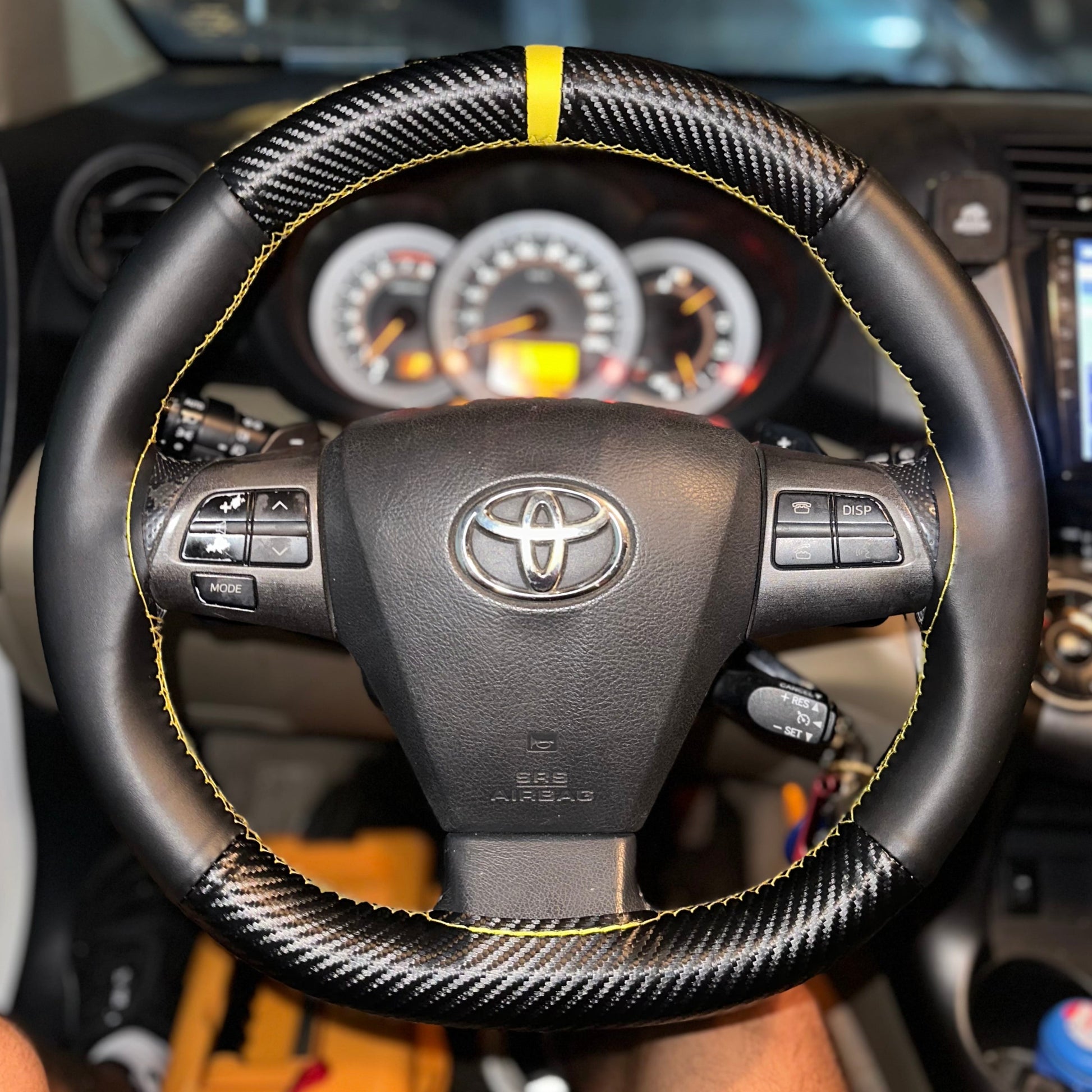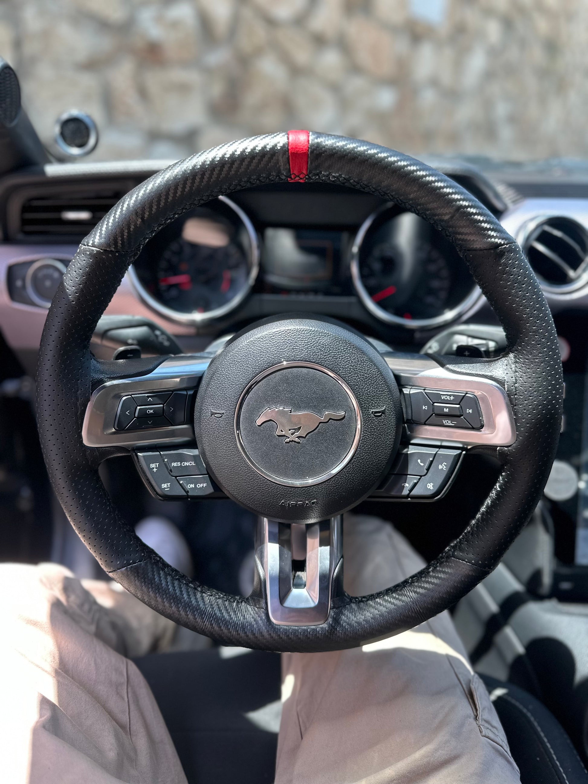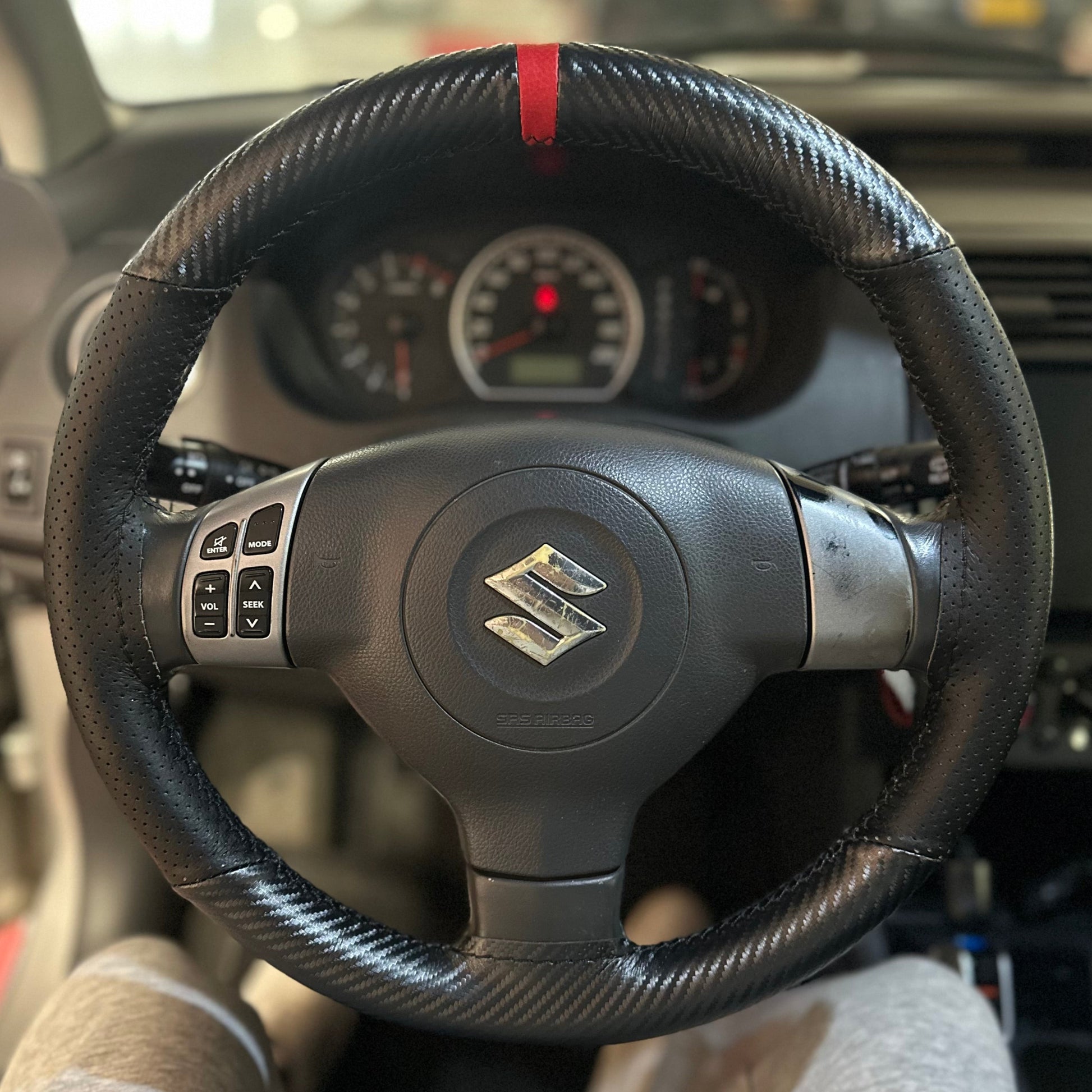 כיסוי מעור אמיתי בגימור קרבון עם תוספת פס מרכוז למראה סופר ספורטיבי ויפה, עם שילוב עור מחורר באיזורי האחיזה.